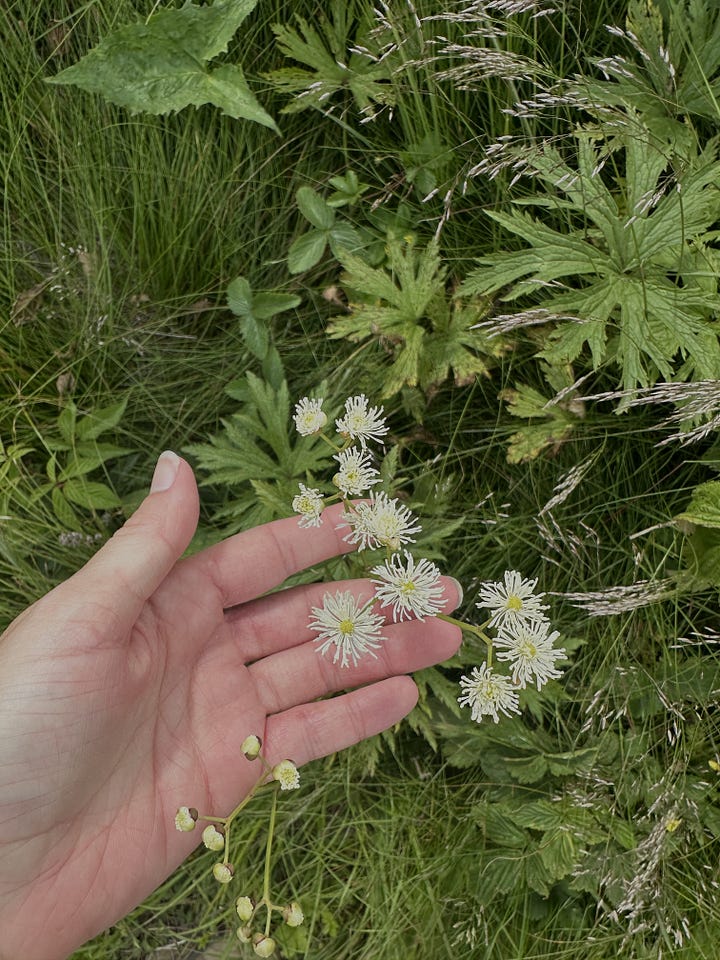The time spent here was spent in admiration of the interplay between tall grasses, and dots of color, green moss as negative space for the pops of pink rhododendron petals, and tiny blue and white flowers among the rocky outcrops. These hikes feed my inspiration as a floral designer and indirectly inspire the plants I cultivate at Tiny Meadow.