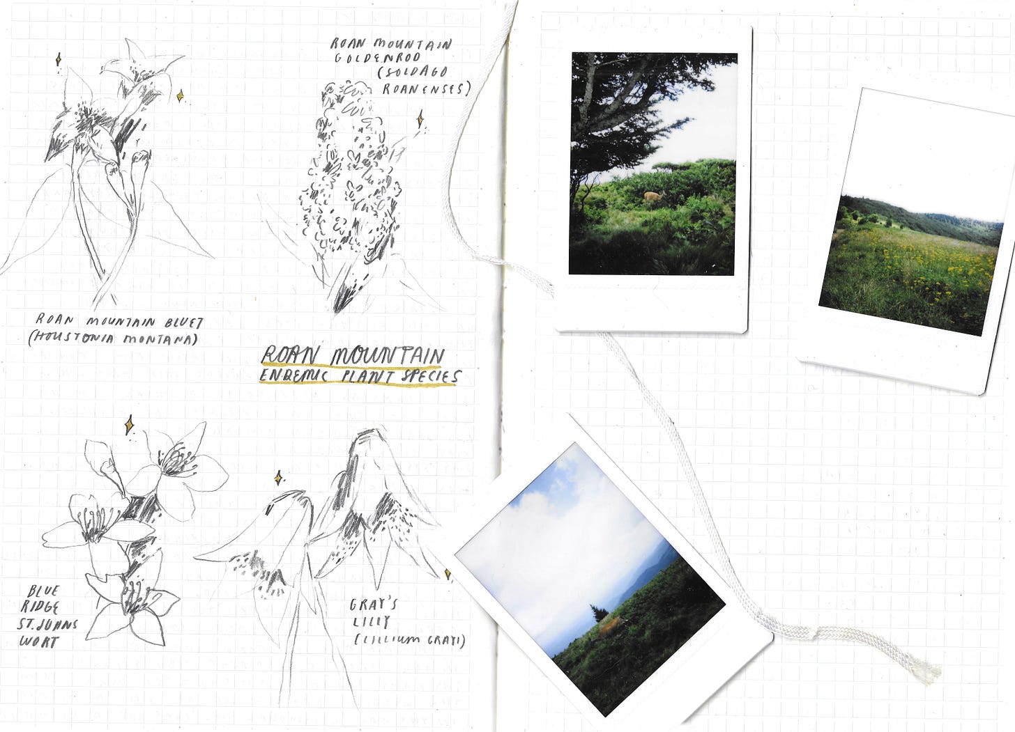 Along the way, I noticed the elderflowers starting to fade while countless blueberries formed large round patches, their fruits still small and dusty grey now but will soon turn a deep blue in a few weeks — I make myself a mental note to come back in a few weeks with a basket. We spotted several endemic plant species - Grays Lilly (Lilium Grayi), Roan mountain Goldenrod (Soldago Roanenses), and Blue Ridge St. Johns Wort (Hypericum buckleyi).