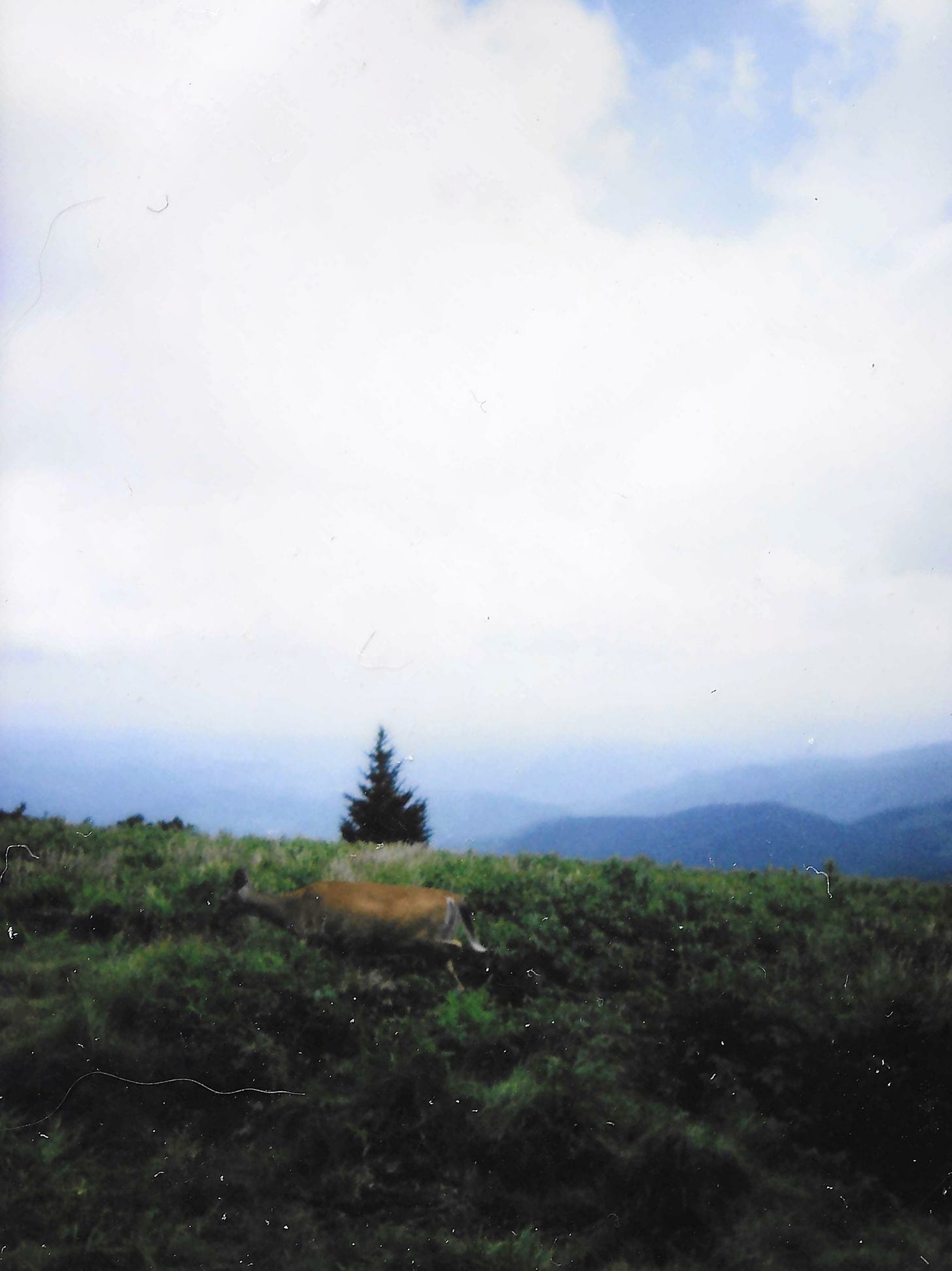 At the summit, I found myself surrounded by Catawba Rhododendrons, shedding their flowers greatly now that summer is here, the air filled with the buzz of pollinators. Their neon pink petals all over the mossy and grassy forest floor, reverberating pink against the green. Once I got to Grassy Ridge Bald, I crossed paths with a doe several times, gracefully navigating its trail through the green and pink, grazing.